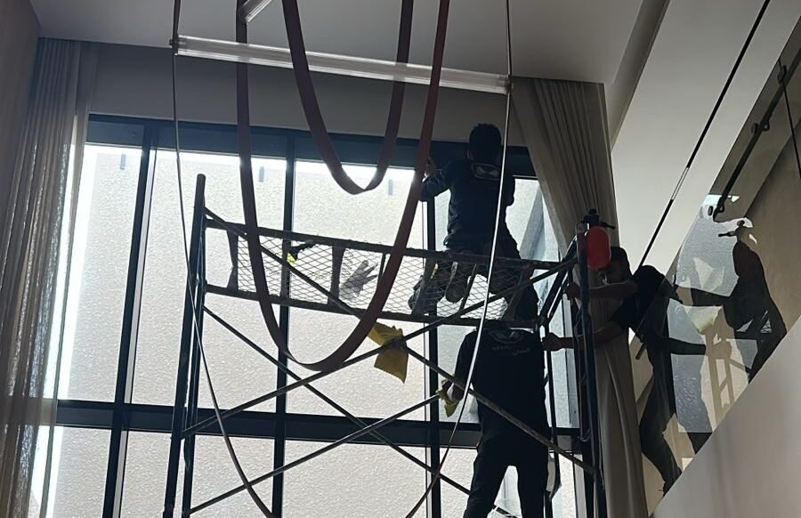 معاينة الموقع: نفحص جهة الشمس، نوع زجاج، المساحات، ونقيس.